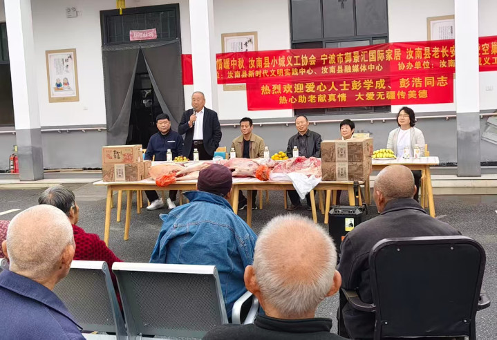 2025年10月3日上午,汝南县三门闸中合养老服务中心院内暖意融融,一场以“情暖中秋,关爱空巢老人”为主题的公益慰问活动在此开展。汝南县古塔街道民政所所长刘景明,爱心人士彭学成及其家人(夫人、儿子彭灏),汝南县老长安总经理马腾,汝南县小城义工协会副会长徐月梅、史超、冯亮等一行人,带着满满的心意走进养老服务中心,为这里的老人们送上了猪肉、羊肉、月饼、水果等物资,更传递了浓浓的中秋祝福。